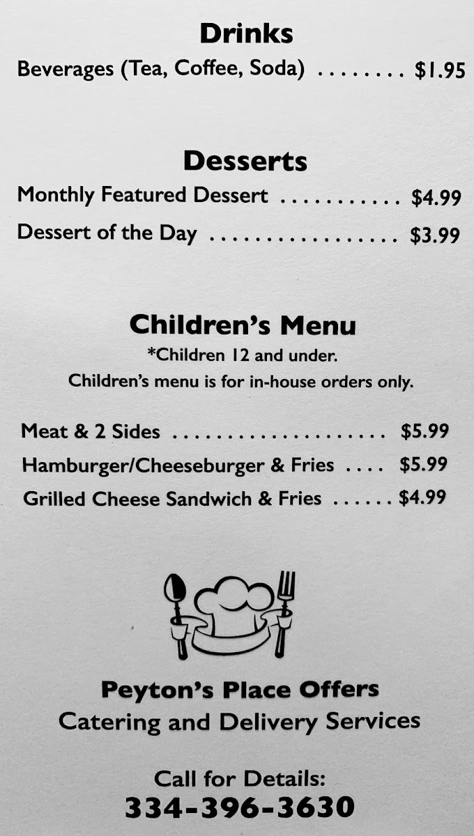 The menu at Peyton’s Place LLC offers a straightforward, home-style Southern dining experience that feels unpretentious and inviting. You’ll find comforting plates crafted from familiar favorites, ideal for a midday meal or a relaxed early dinner. The dishes are served in generous portions, designed to satisfy without fuss.