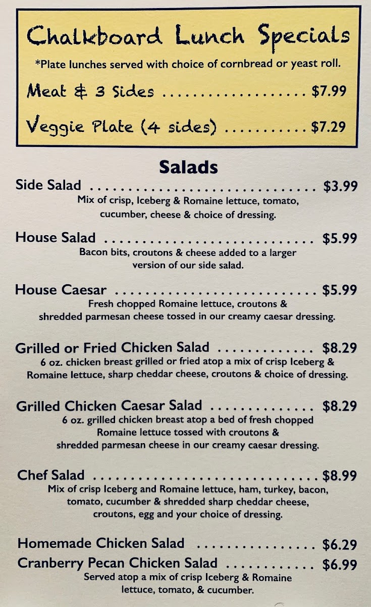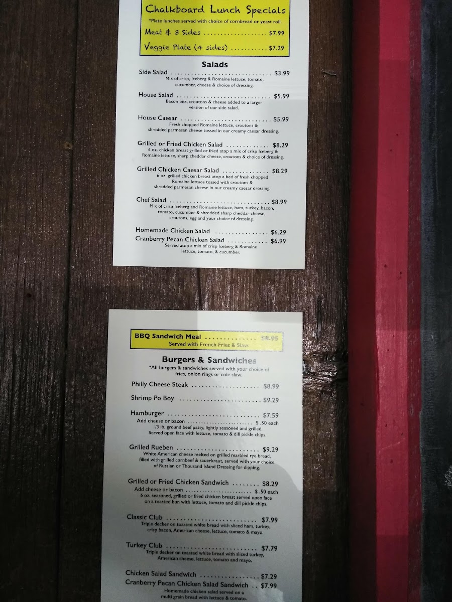 Typical offerings include hearty platters like fried catfish or grilled lemon pepper shrimp, each accompanied by your choice of classic Southern sides. There are also lighter options, such as fresh salads featuring grilled or fried chicken, as well as simple children’s meals that fit well into family visits. The menu balances well-loved Southern staples with everyday ease, fitting naturally with the cozy, no-frills atmosphere of the restaurant.
